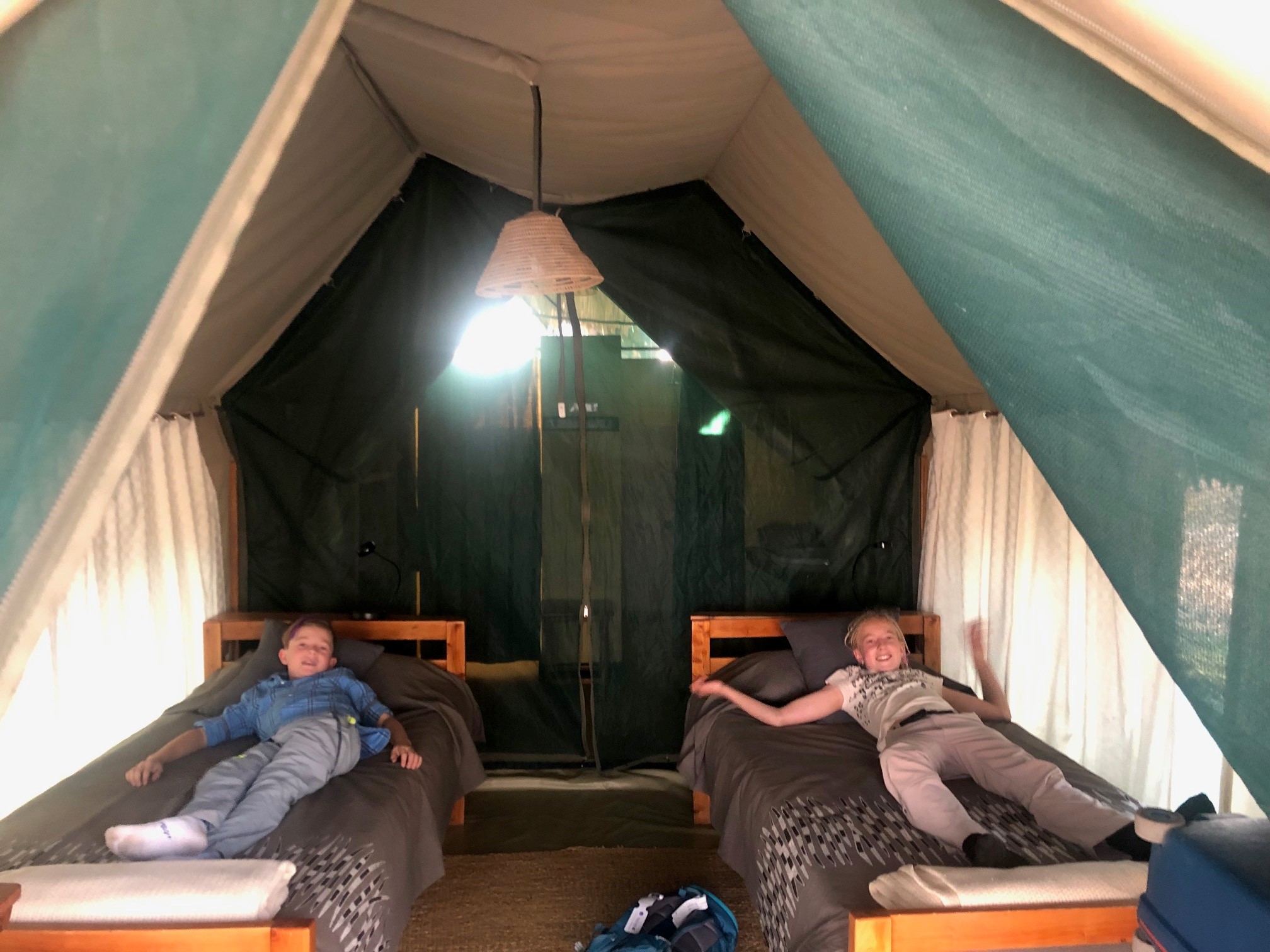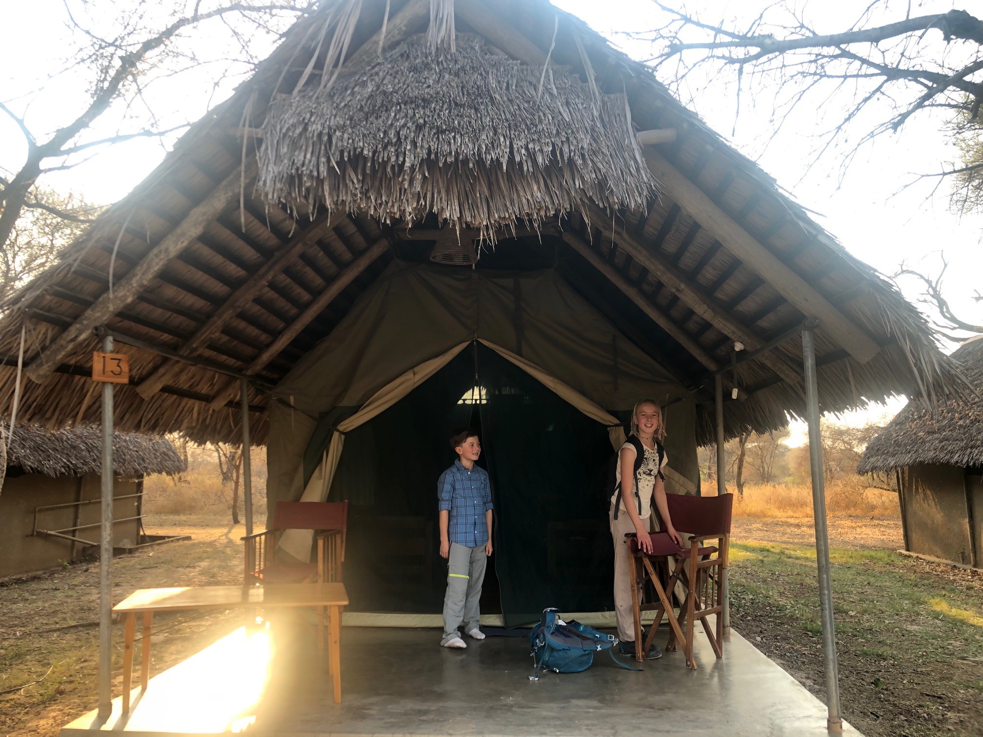 Unsere Unterkünfte sind schlichtweg der Hammer. Die erste Nacht verbrachten wir in zwei sehr schönen Zelten mitten in der Wildnis. Um etwa 1Uhr nachts wurden wir von einem riesigen Tumult hinter unserem Zelt geweckt. Wir dachten es seien bestimmt Affen und wir schliefen weiter. Wie sich am nächsten Morgen herausstellte, sind Affen gar nicht nachtaktiv und es war eine Gruppe Löwen (7 Stück), welche bei den Zelten spielten. Zum Glück sind sie dann zu einer anderen schweizer Familie weitergezogen und haben dort das ganze Vorzelt demoliert😮