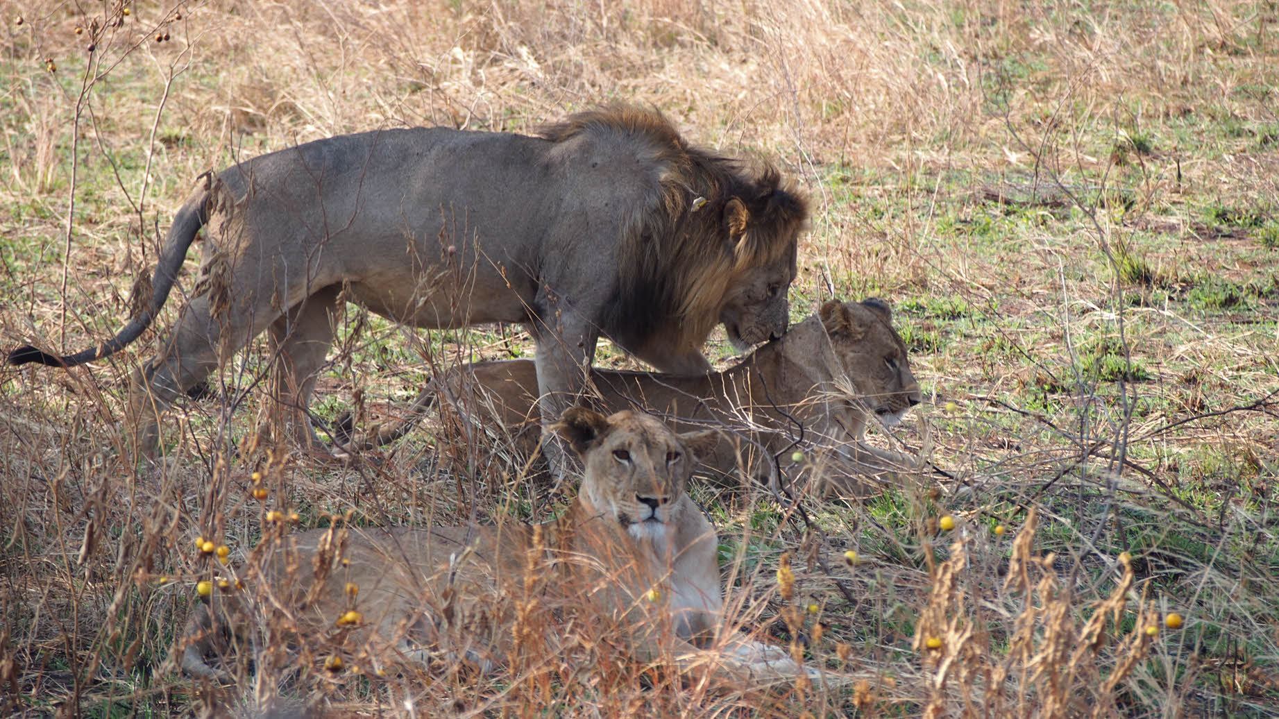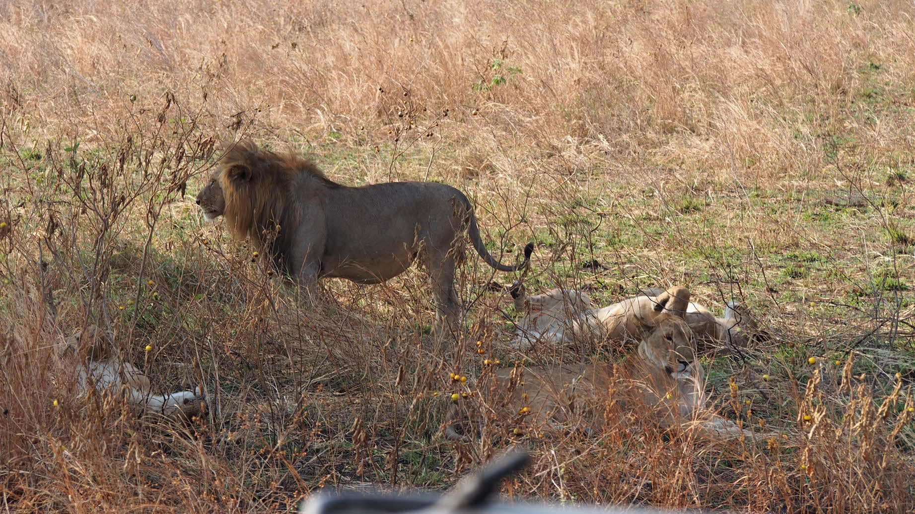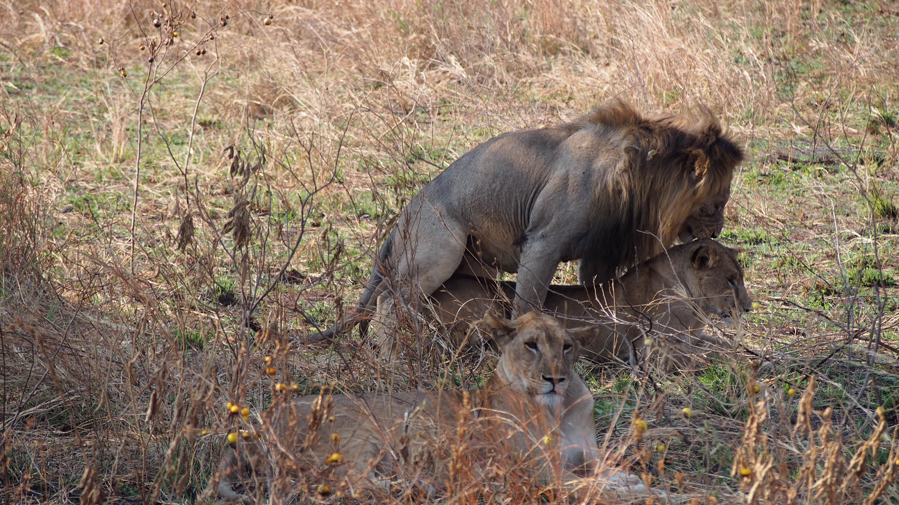 Etwas später sahen wir eine Gruppe Löwen neben uns im Gras liegen. Das Harems-Männchen hatte alle Hände voll zu tun, alle seine Weibchen zu begatten🤭
