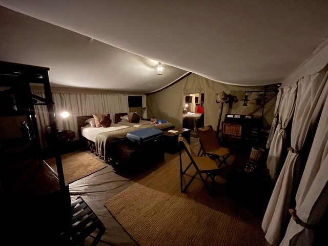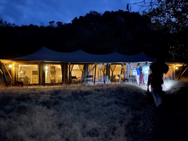 In der Serengeti schliefen wir zwei Nächte im Pioneer Camp, welches etwas oberhalb mit Blick auf die Serengeti liegt. Wir teilten uns ein riesiges Familienzelt im Kolonialstil, mit 2 Doppelbetten und 2 Badezimmern. Gegessen wurde dann im Laternenlicht mit Blick auf die unendlichen Weiten der Serengeti. Welch traumhaftes Erlebnis. Wenn es dunkel wird, kann es dort ganz schön gefährlich werden, da sich Löwen, Leoparde, Elefanten, Affen und Büffel herumtrieben. Vom Tisch zum Zelt mussten wir daher vom Maasai-Krieger Daniel (welch passender Name;-)) begleitet werden. Wir dachten uns, dass dies wohl eher Show wäre...