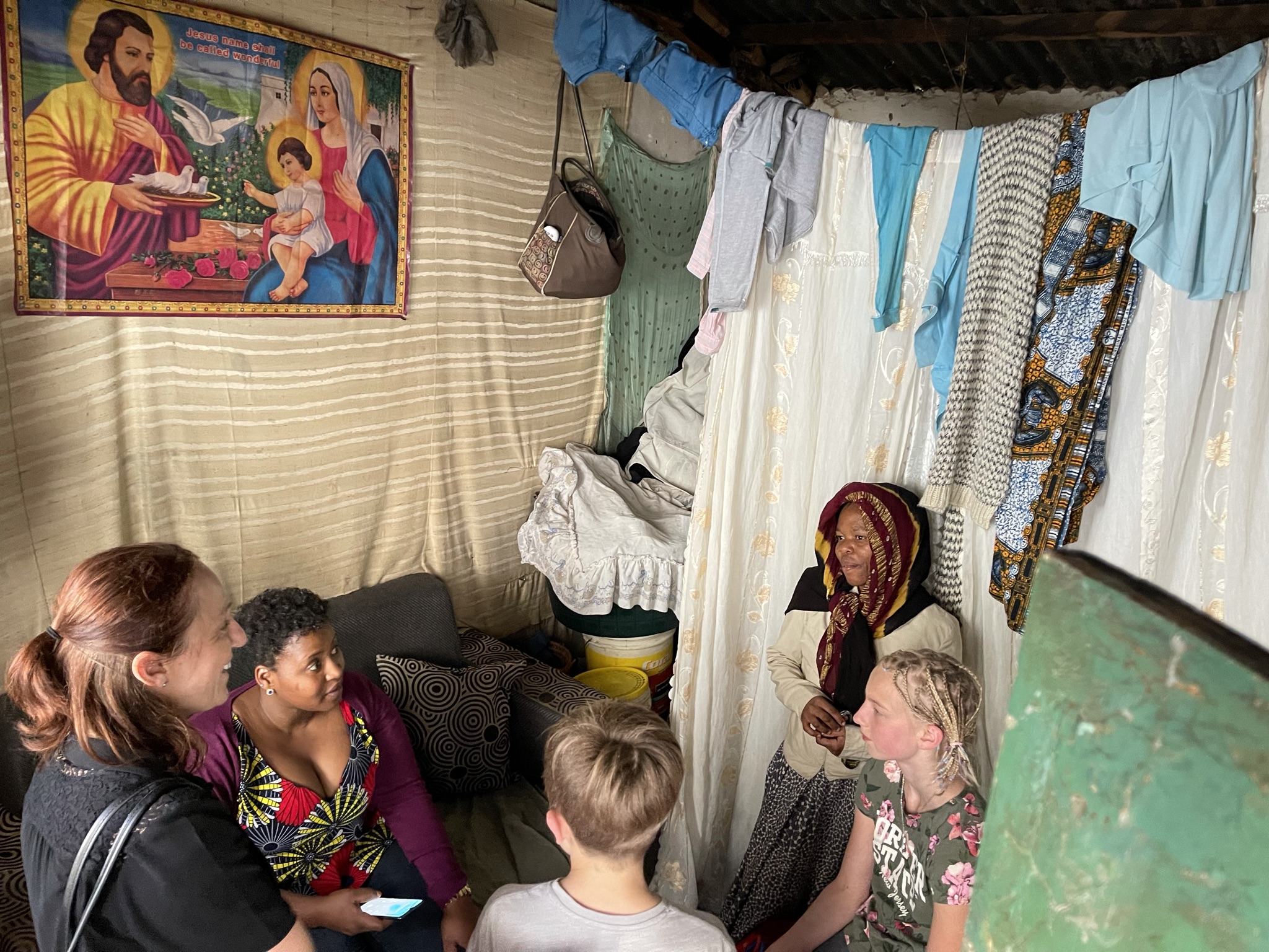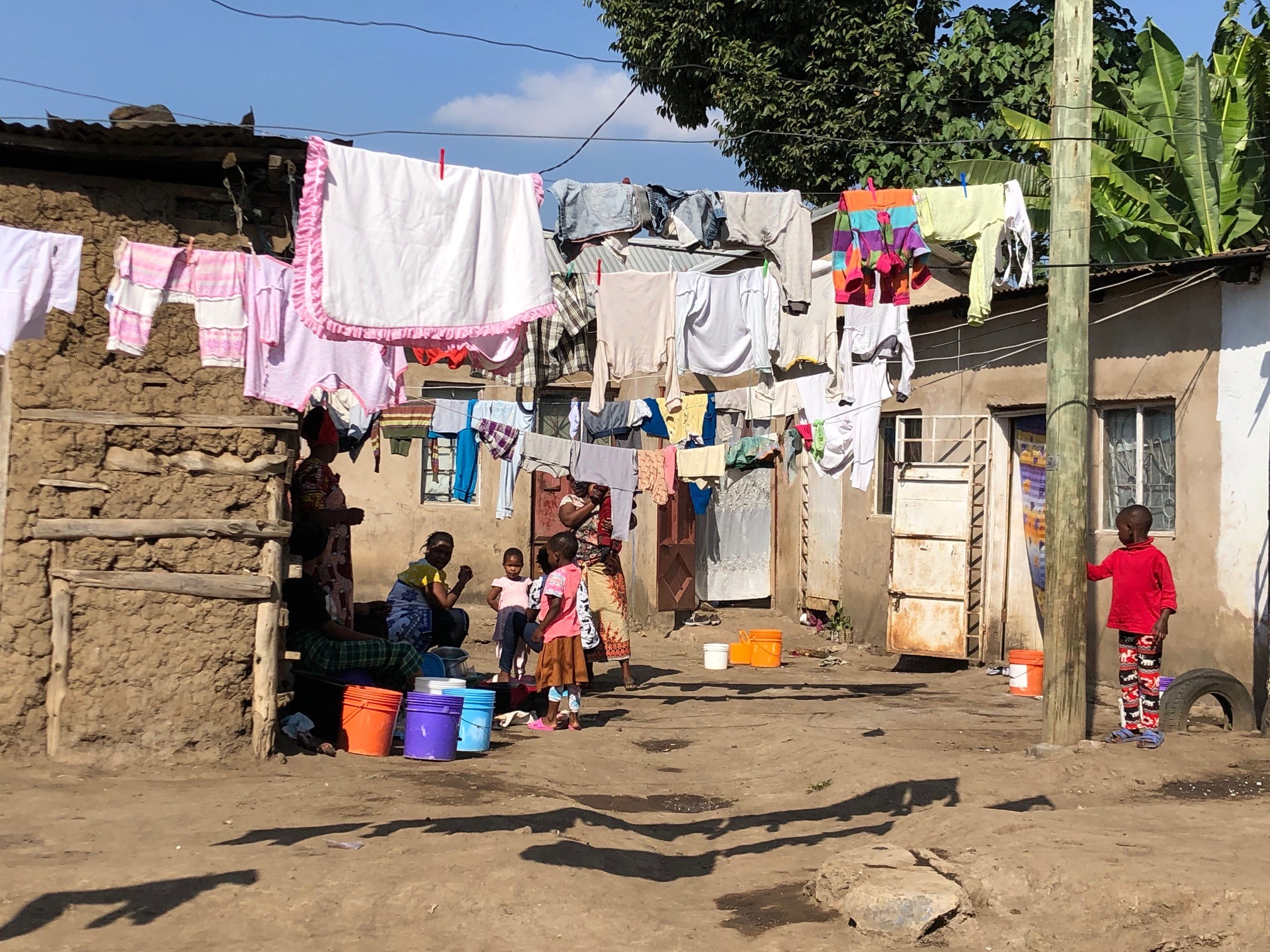 Zum Dank für unsere Spenden führte uns Thedy im Anschluss ins Wohnquartier der Frauen. Alle unterstützten Frauen wurden von ihren Männern verlassen und müssen nun für mehrere Kinder und sich selbst sorgen. So teilen sich eine Mutter und ihre 3 Kinder einen kleinen Raum mit einem Bett. Neben dem Bett steht der kleine Kohlegrill, die Küche. Sonst gibt es nichts - keine Kleider, keine Spielsachen. Nur etwa 10 Eimer, um wöchentlich das Wasser zu holen😮. Eine Innen-Toilette, Fehlanzeige. Diese steht draussen und wird von etwa 10 Mütter mit 30 Kindern geteilt. Alle Mütter sind hier Wäscherinnen oder Näherinnen und können sich mit Thedys Hilfe wenigstens ein kleines Einkommen verdienen, um nicht zu verhungern. Die Kleinen Kinder dürfen tagsüber kostenlos ins Daycare-Center der Wehaf.